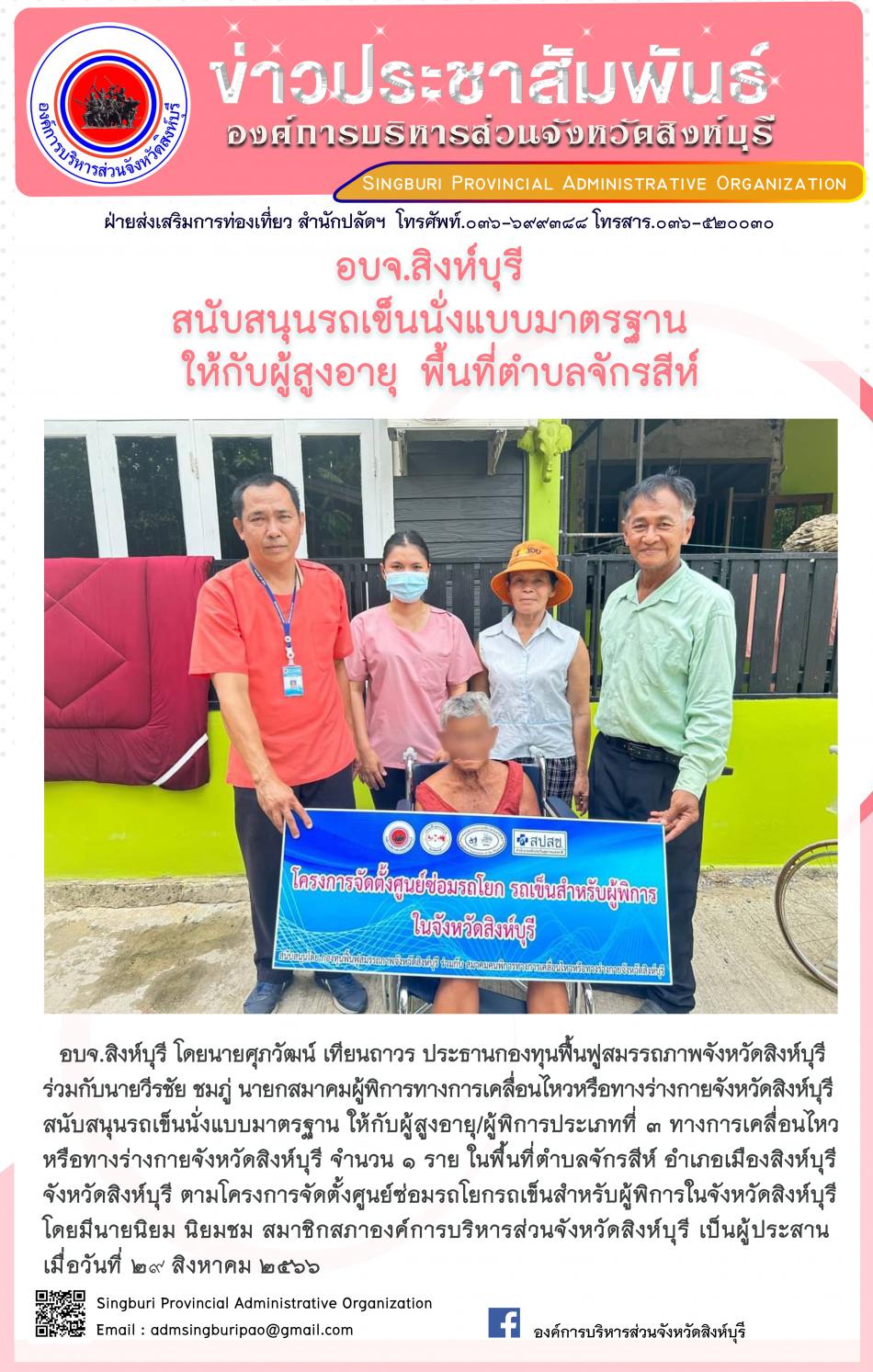 อบจ.สิงห์บุรี สนับสนุนรถเข็นนั่งแบบมาตรฐาน ให้กับผู้สูงอายุ พื้นที่ตำบลจักรสีห์ [29 สิงหาคม 2566]
