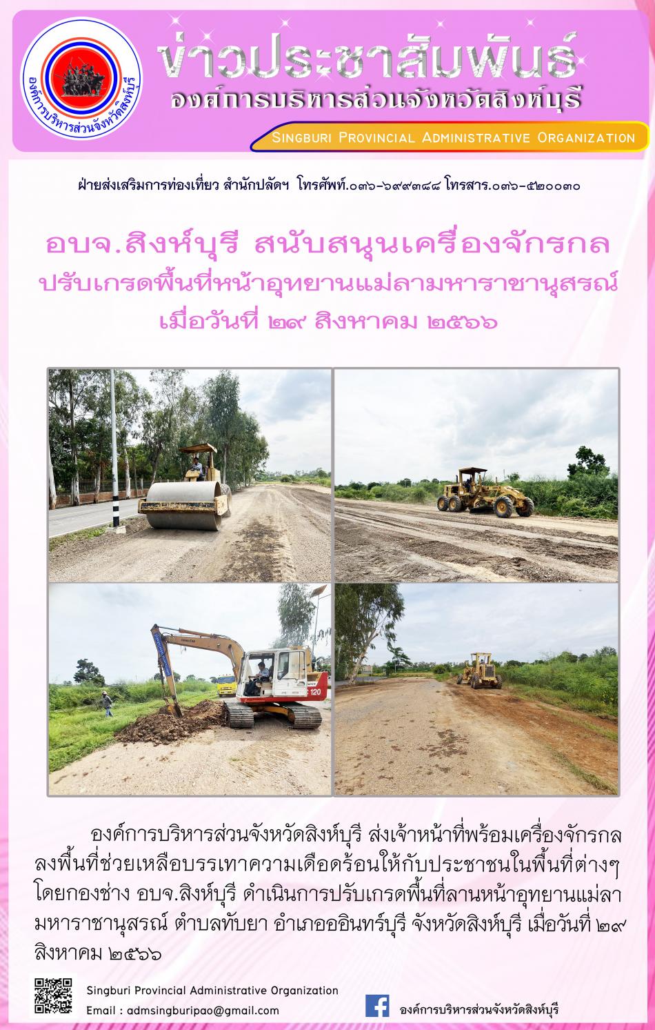 อบจ.สิงห์บุรี สนับสนุนเครื่องจักรกลปรับเกรดพื้นที่หน้าอุทยานแม่ลามหาราชานุสรณ์ [29 สิงหาคม 2566]