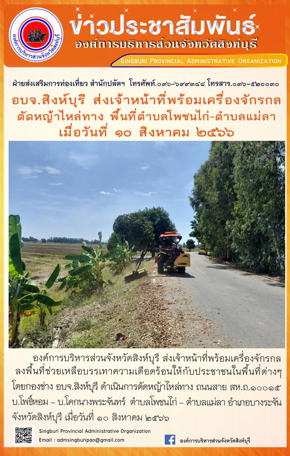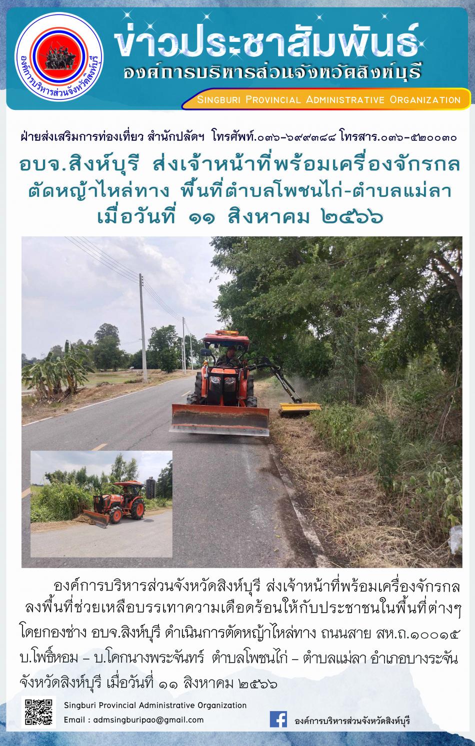 อบจ.สิงห์บุรี ส่งเจ้าหน้าที่พร้อมเครื่องจักรกล ตัดหญ้าไหล่ทาง พื้นที่ตำบลโพชนไก่ - ตำบลแม่ลา [11 สิงหาคม 2566]