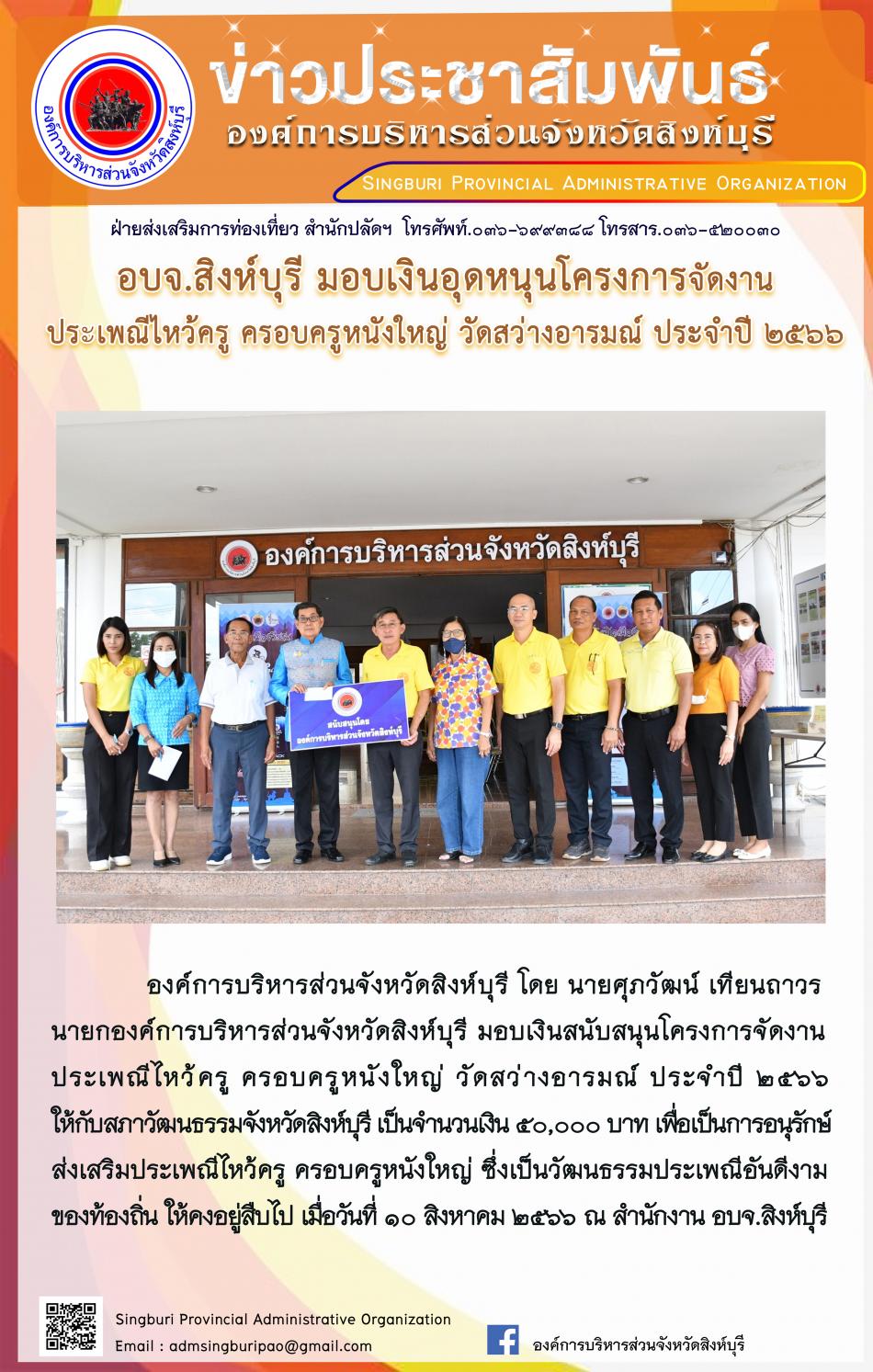 อบจ.สิงห์บุรี มอบเงินอุดหนุนโครงการจัดงาน ประเพณีไหว้ครู ครอบครูหนังใหญ่ วัดสว่างอารมณ์ ประจำปี 2566 [10 สิงหาคม 2566]