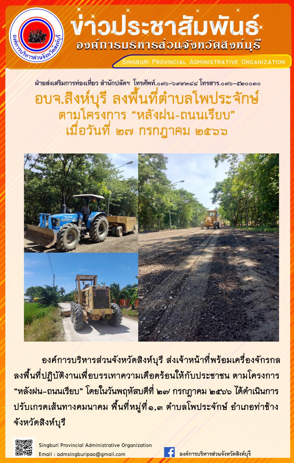 อบจ.สิงห์บุรี ลงพื้นที่ตำบลโพประจักษ์ ตามโครงการ "หลังฝน - ถนนเรียบ" [27 กรกฎาคม 2566]