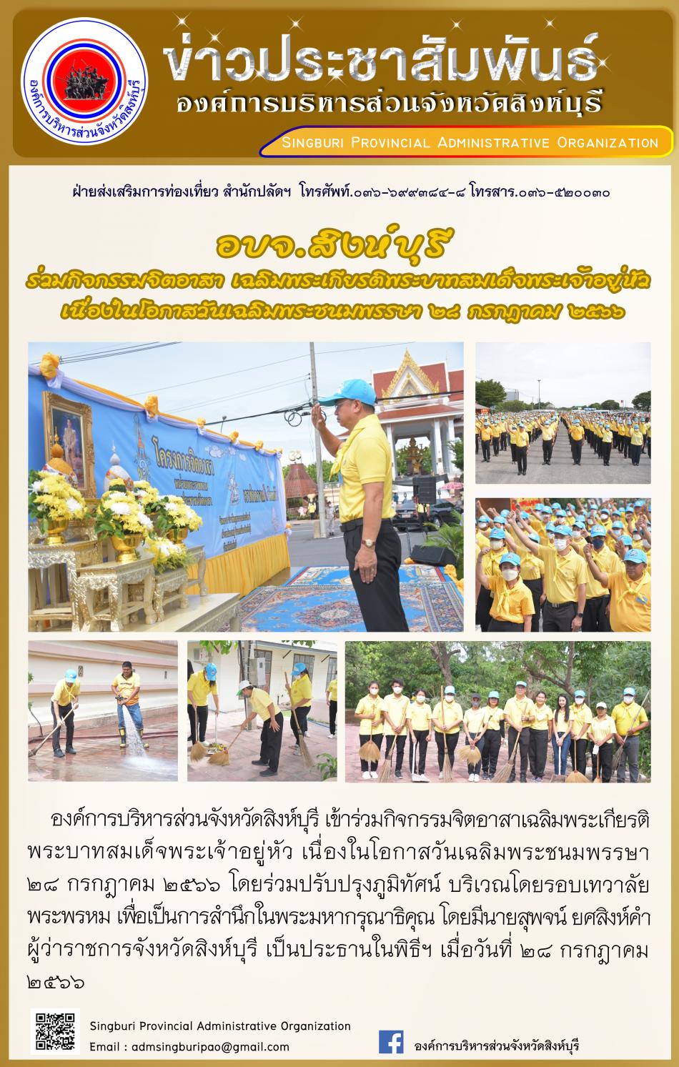 อบจ.สิงห์บุรี ร่วมกิจกรรมจิตอาสา เฉลิมพระเกียรติพระบาทสมเด็จพระเจ้าอยู่หัว เนื่องในโอกาสวันเฉลิมพระชนมพรรษา 28 กรกฏาคม 2566 [28 กรกฎาคม 2566]