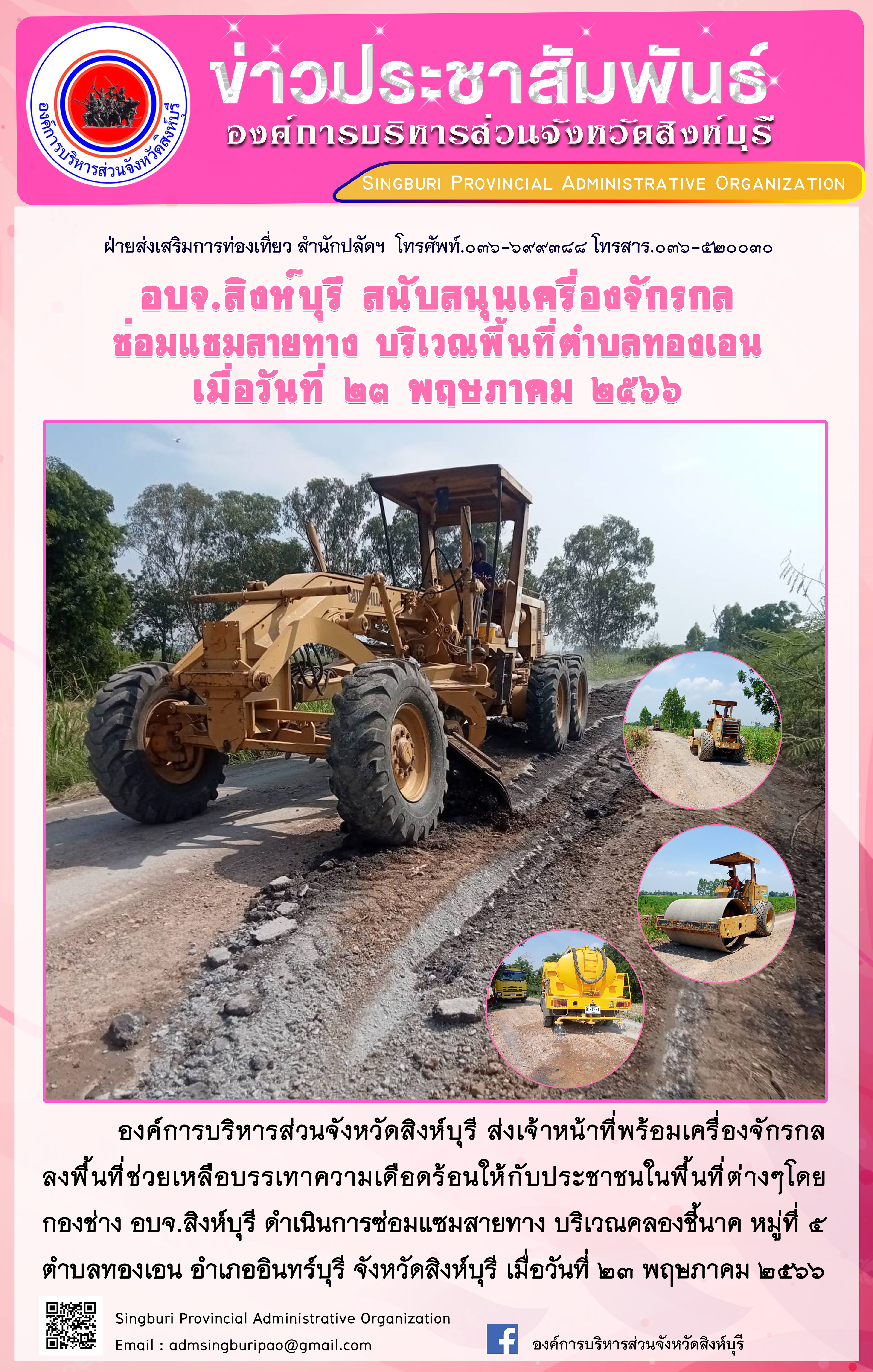อบจ.สิงห์บุรี สนับสนุนเครื่องจักรกล ซ่อมแซมสายทาง บริเวณพื้นที่ตำบลทองเอน [23 พฤษภาคม 2566]