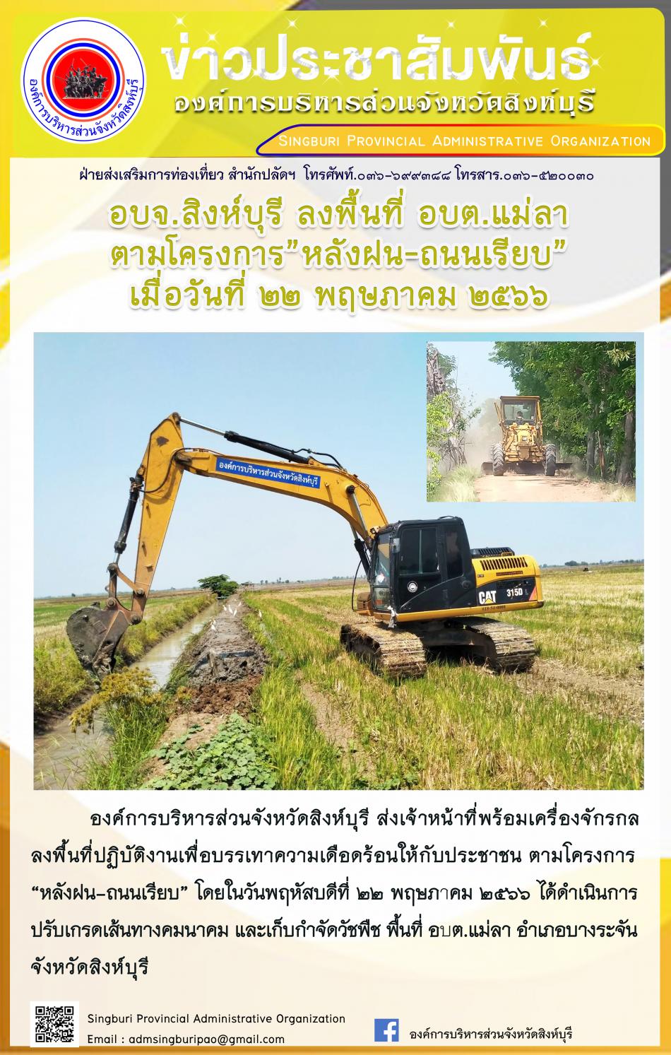 อบจ.สิงห์บุรี ลงพื้นที่ อบต.แม่ลา ตามโครงการ "หลังฝน - ถนนเรียบ" [22 พฤษภาคม 2566]