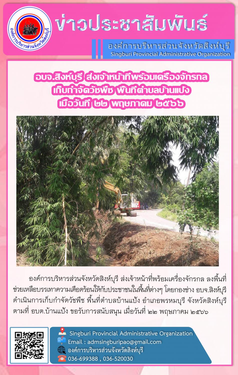 อบจ.สิงห์บุรี ส่งเจ้าหน้าที่พร้อมเครื่องจักรกล เก็บกำจัดวัชพืช พื้นที่ตำบลบ้านแป้ง [22 พฤษภาคม 2566]