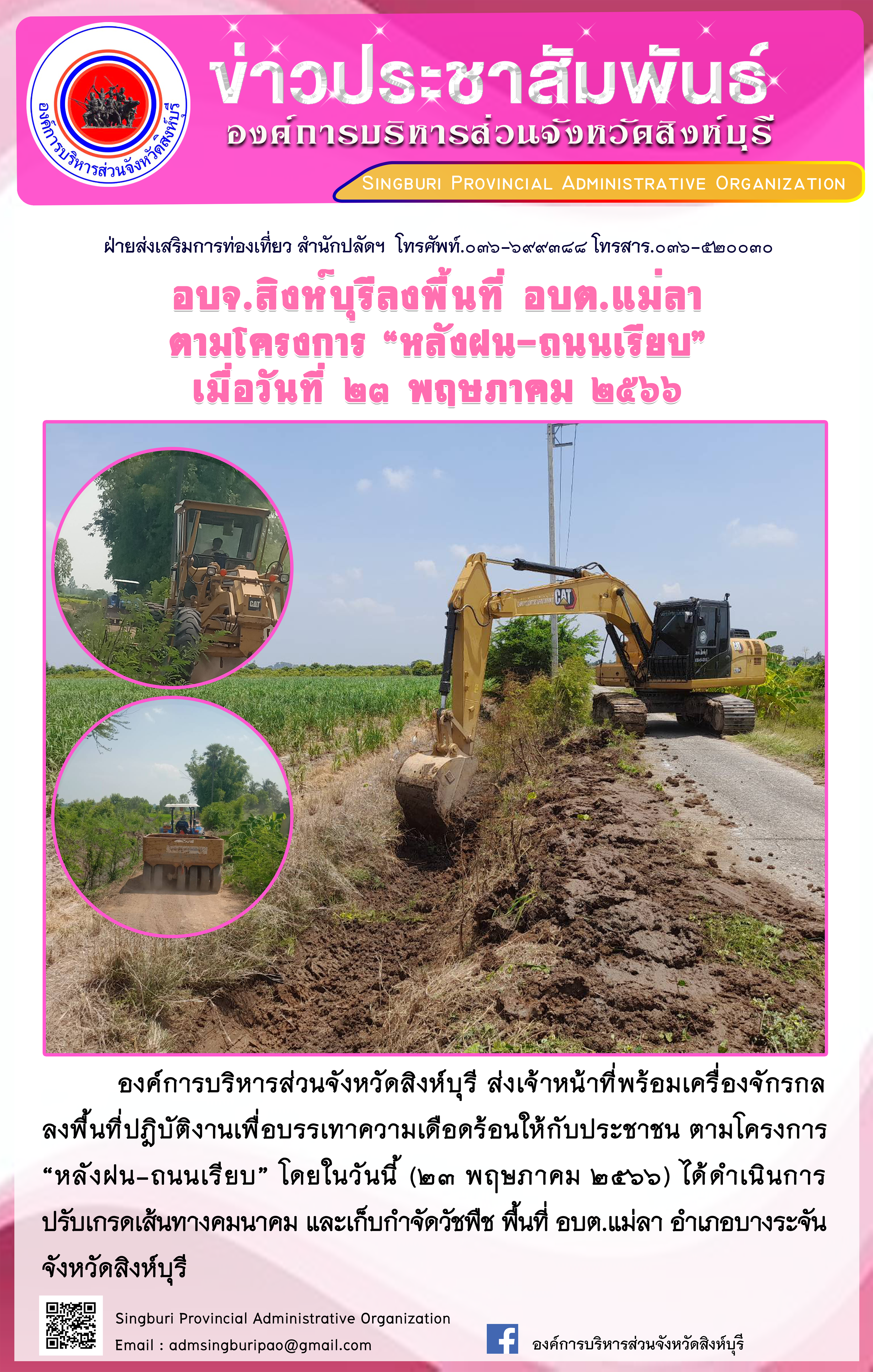 อบจ.สิงห์บุรี ลงพื้นที่ อบต.แม่ลา ตามโครงการ "หลังฝน - ถนนเรียบ" [23 พฤษภาคม 2566]