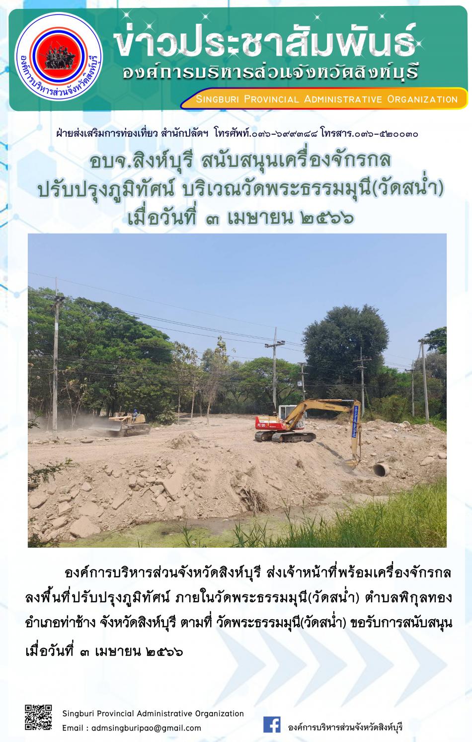 อบจ.สิงห์บุรี สนับสนุนเครื่องจักรกลปรับปรุงภูมิทัศน์ บริเวณวัดพระธรรมมุนี(วัดสน่ำ) [3 เมษายน 2566]