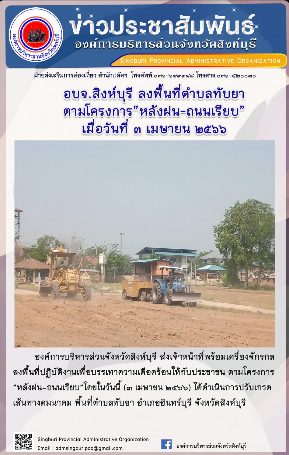 อบจ.สิงห์บุรี ลงพื้นที่ตำบลทับยา ตามโครงการ "หลังฝน - ถนนเรียบ" [3 เมษายน 2566]