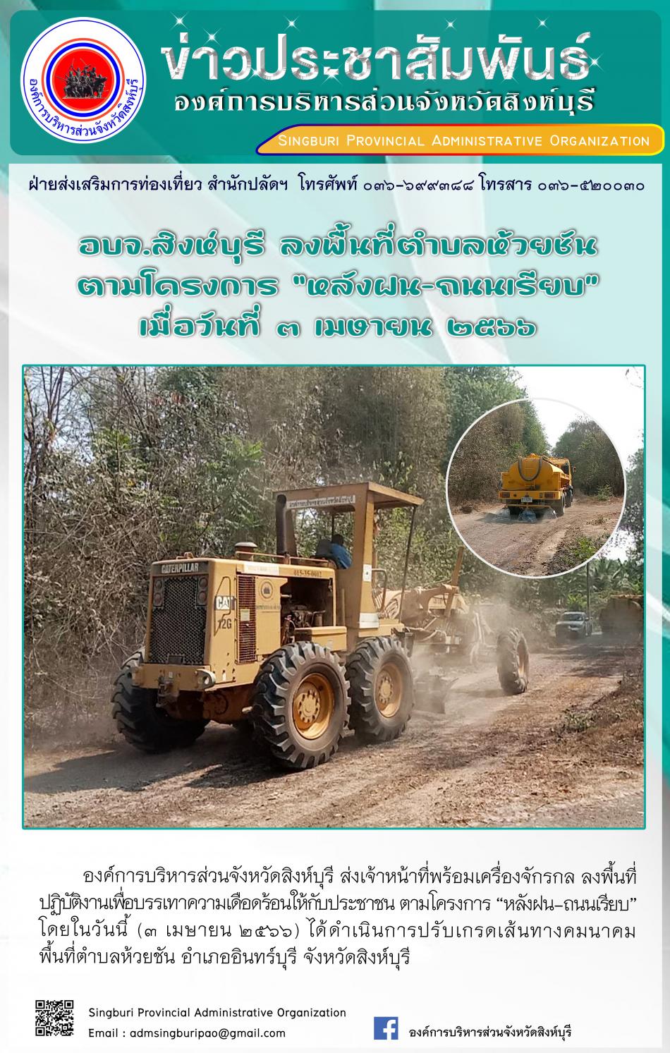 อบจ.สิงห์บุรี ลงพื้นที่ตำบลห้วยชันตามโครงการ "หลังฝน - ถนนเรียบ" [3 เมษายน 2566]