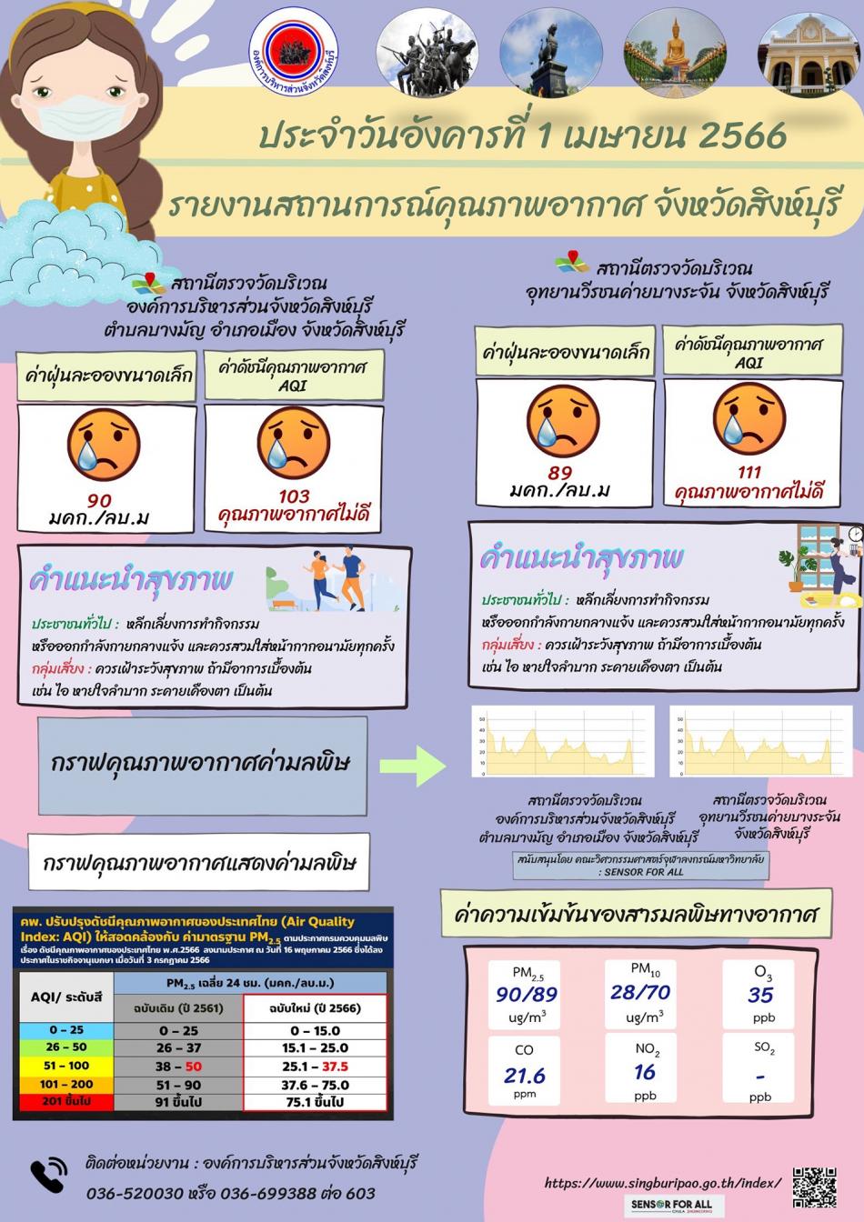 ประชาสัมพันธ์รายงานสถานการณ์คุณภาพอากาศ จังหวัดสิงห์บุรี [1 เมษายน 2566]