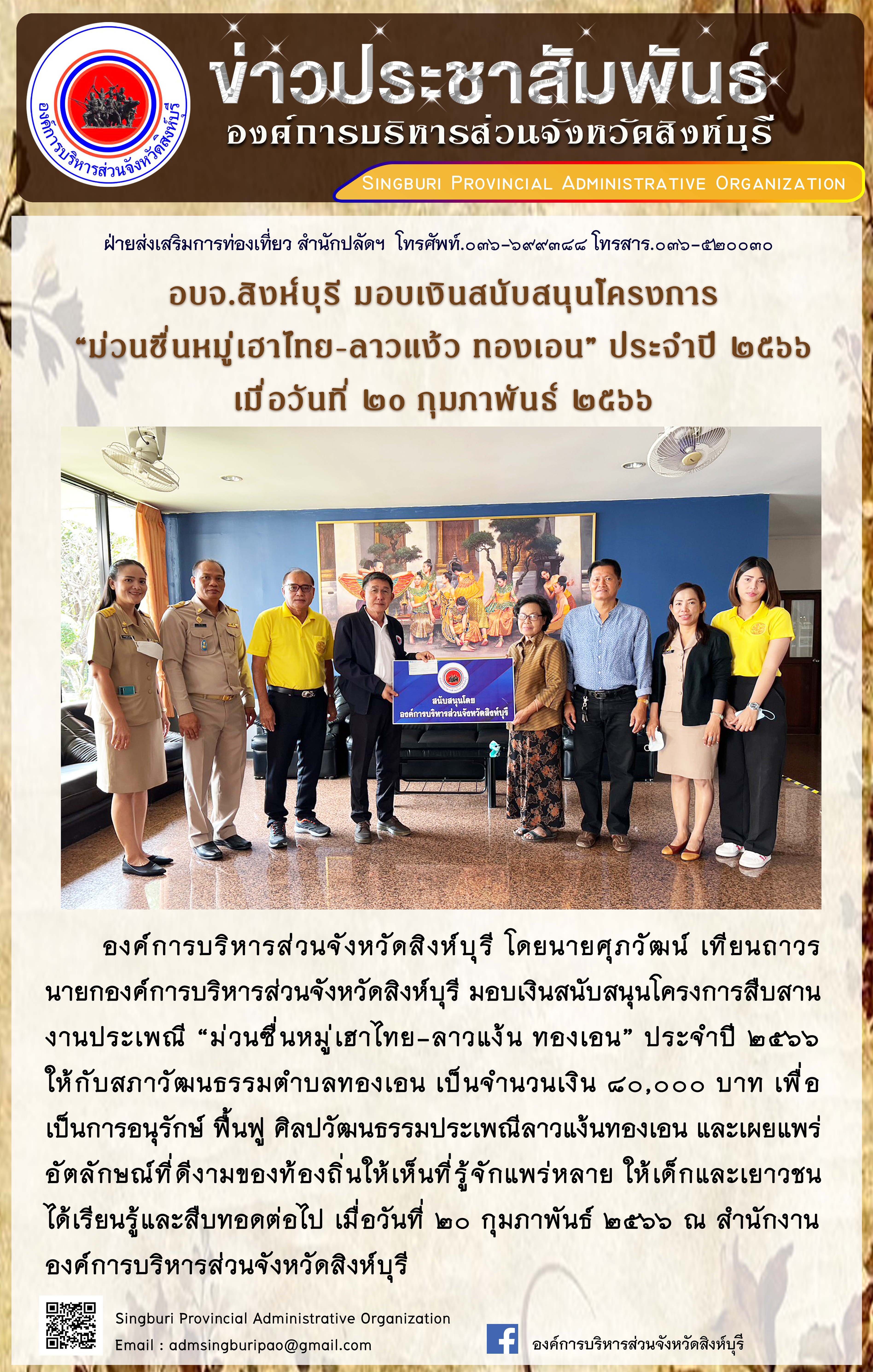 อบจ.สิงห์บุรี มอบเงินสนับสนุนโครงการ "ม่วนซื่นหมู่เฮาไทย-ลาวแง้ว ทองเอน " ประจำปี 2566 [20 กุมภาพันธ์ 2566]