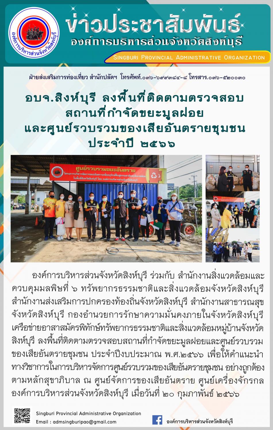 อบจ.สิงห์บุรี ลงพื้นที่ติตามตรวจสอบสถานที่กำจัดขยะมูลฝอยและศุนย์รวบรวมของเสียอันตรายชุมชน [20 กุมภาพันธ์ 2566]