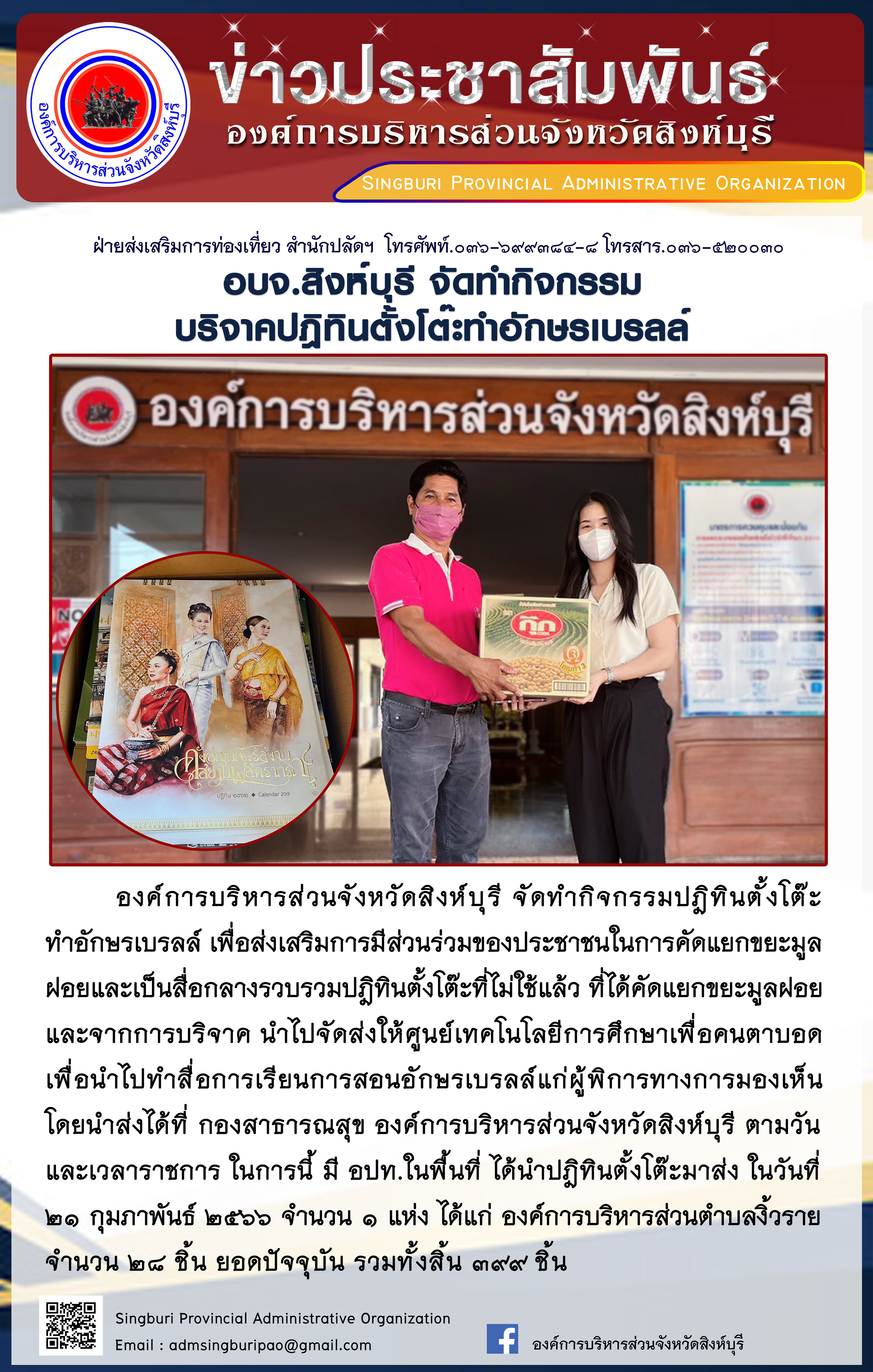 อบจ.สิงห์บุรี จัดทำกิจกรรมบริจาคปฏิทินตั้งโต๊ะทำอักษรเบรลล์ [21 กุมภาพันธ์ 2566]