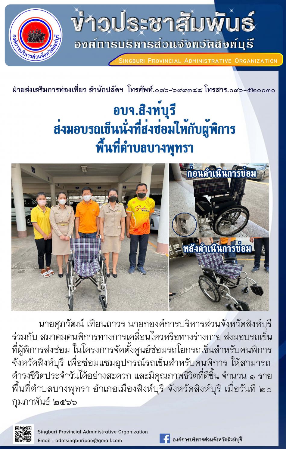 อบจ.สิงห์บุรี ส่งมอบรถเข็นที่ส่งซ่อมให้กับผู้พิการ พื้นที่ตำบลบางพุทรา [20 กุมภาพันธ์ 2566]