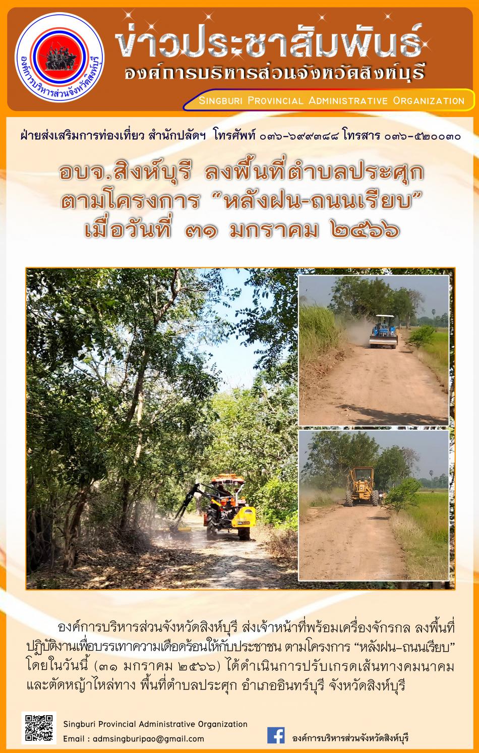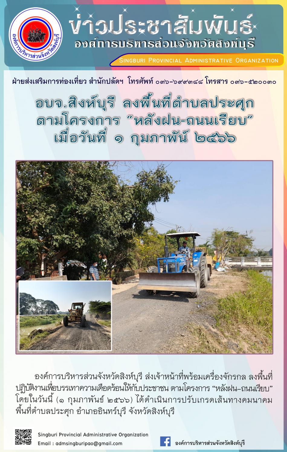 อบจ.สิงห์บุรี ลงพื้นที่ตำบลประศุกตามโครงการ "หลังฝน-ถนนเรียบ" [31 มกราคม 2566]