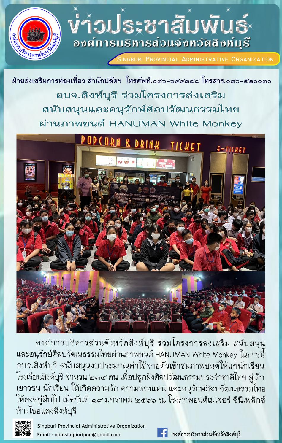 อบจ.สิงห์บุรี ร่วมโครงการส่งเสริมสนับสนุนและอนุรักษ์ศิลปวัฒนธรรมไทย ผ่านภาพยนต์ HANUAN White Monkey [19 มกราคม 2566]