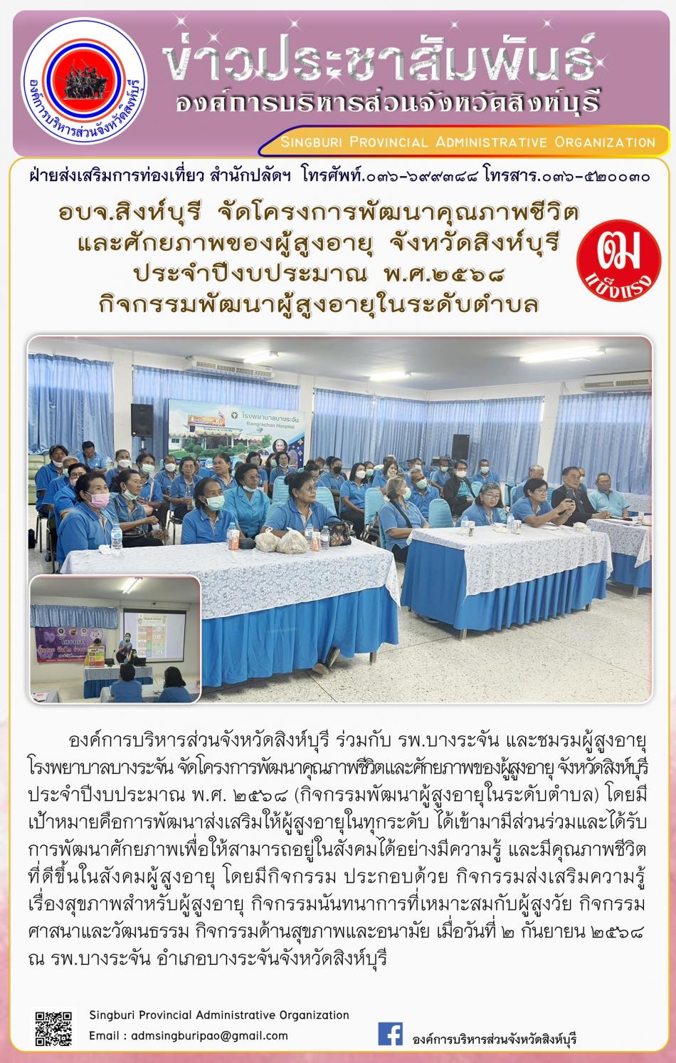 อบจ. สิงห์บุรี จัดโครงการพัฒนาคุณภาพชีวิตและศักยภาพของผู้สูงอายุ จังหวัด สิงห์บุรี ประจำประจำปีงบประมาณปี พ. ศ. 2568 กิจกรรมพัฒนาผู้สูงอายุในระดับตำบลกิจกรรมพัฒนาผู้สูงอายุในระดับตำบล [2 กันยายน 2568]