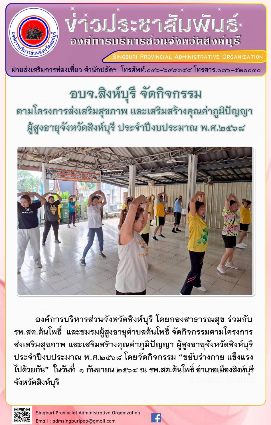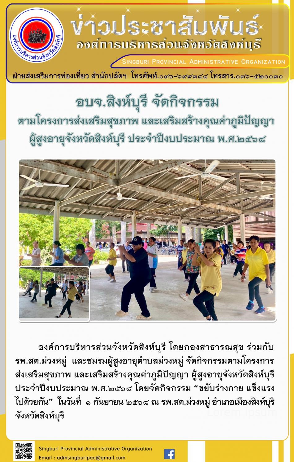 อบจ. สิงห์บุรี จัดกิจกรรมตามโครงการส่งเสริมสุขภาพและ เสริมสร้างคุณค่าภูมิปัญญาผู้สูงอายุจังหวัดสิงห์บุรี ประจำประจำปีงบประมาณ พ. ศ. 2568 [1 กันยายน 2568]
