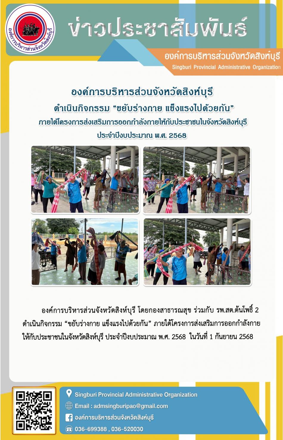 องค์การบริหารส่วนจังหวัดสิงห์บุรี ดำเนินกิจกรรม“ ขยับร่างกาย แข็งแรงไปด้วยกัน” ภายใต้โครงการดำเนินภายใต้โครงการ ส่งเสริมการออกกำลังกาย ส่งเสริมการออกกำลังกายให้กับประชาชนในจังหวัดสิงห์บุรี... [1 กันยายน 2568]