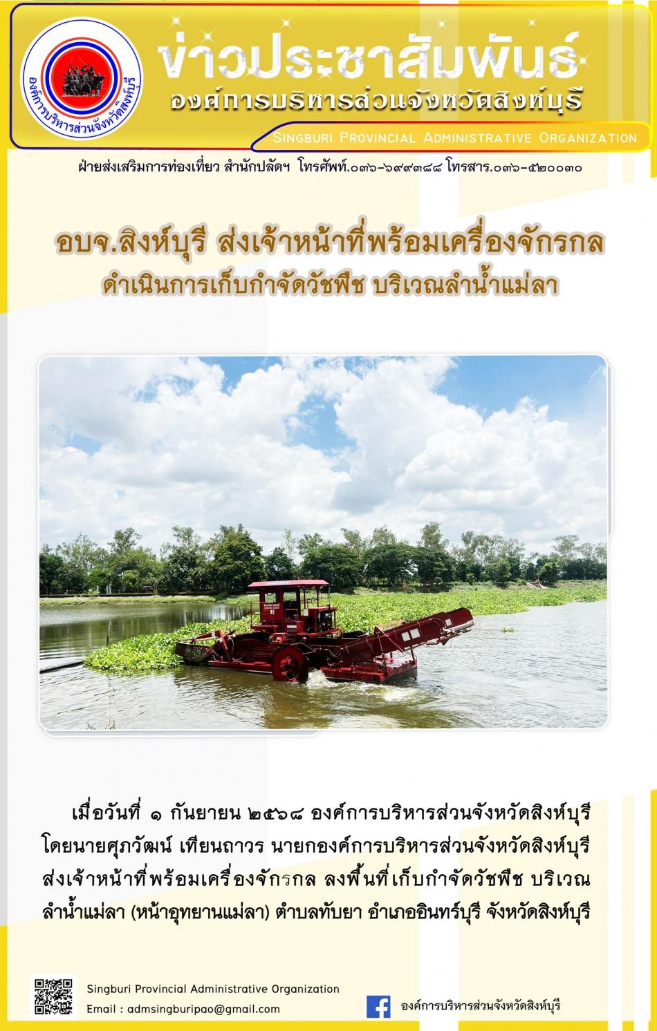 อบจ. สิงห์บุรี ส่งเจ้าหน้าที่พร้อมเครื่องจักรกล ดำเนินการเก็บกำจัดวัชพืช บริเวณ ลำน้ำแม่ลา [1 กันยายน 2568]
