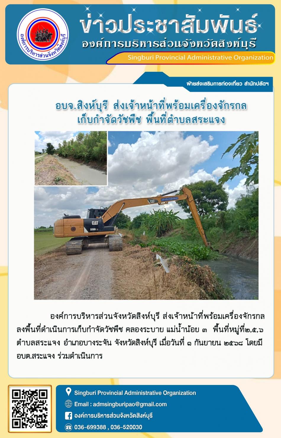 อบจ. สิงห์บุรี ส่งเจ้าหน้าที่พร้อมเครื่องจักรกล เก็บกำจัดวัชพืช พื้นที่ตำบล สระแจง [1 กันยายน 2568]