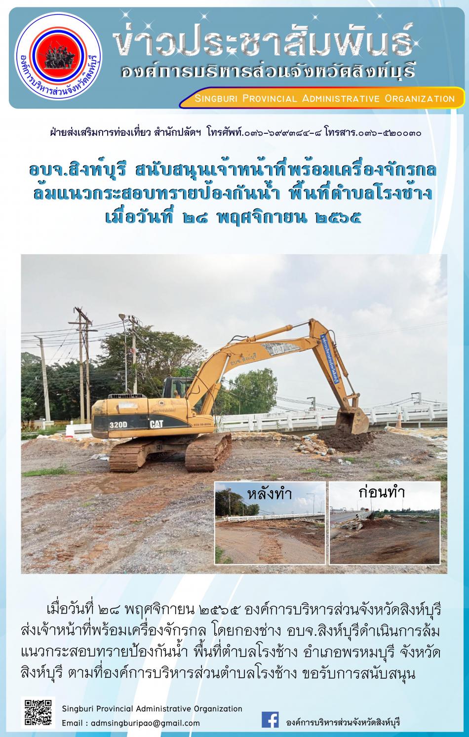 อบจ.สิงห์บุรี สนับสนุนเจ้าหน้าที่พร้อมเครื่องจักรกลล้มแนวกระสอบทรายป้องกันน้ำ พื้นที่ตำบลโรงช้าง [28 พฤศจิกายน 2565]