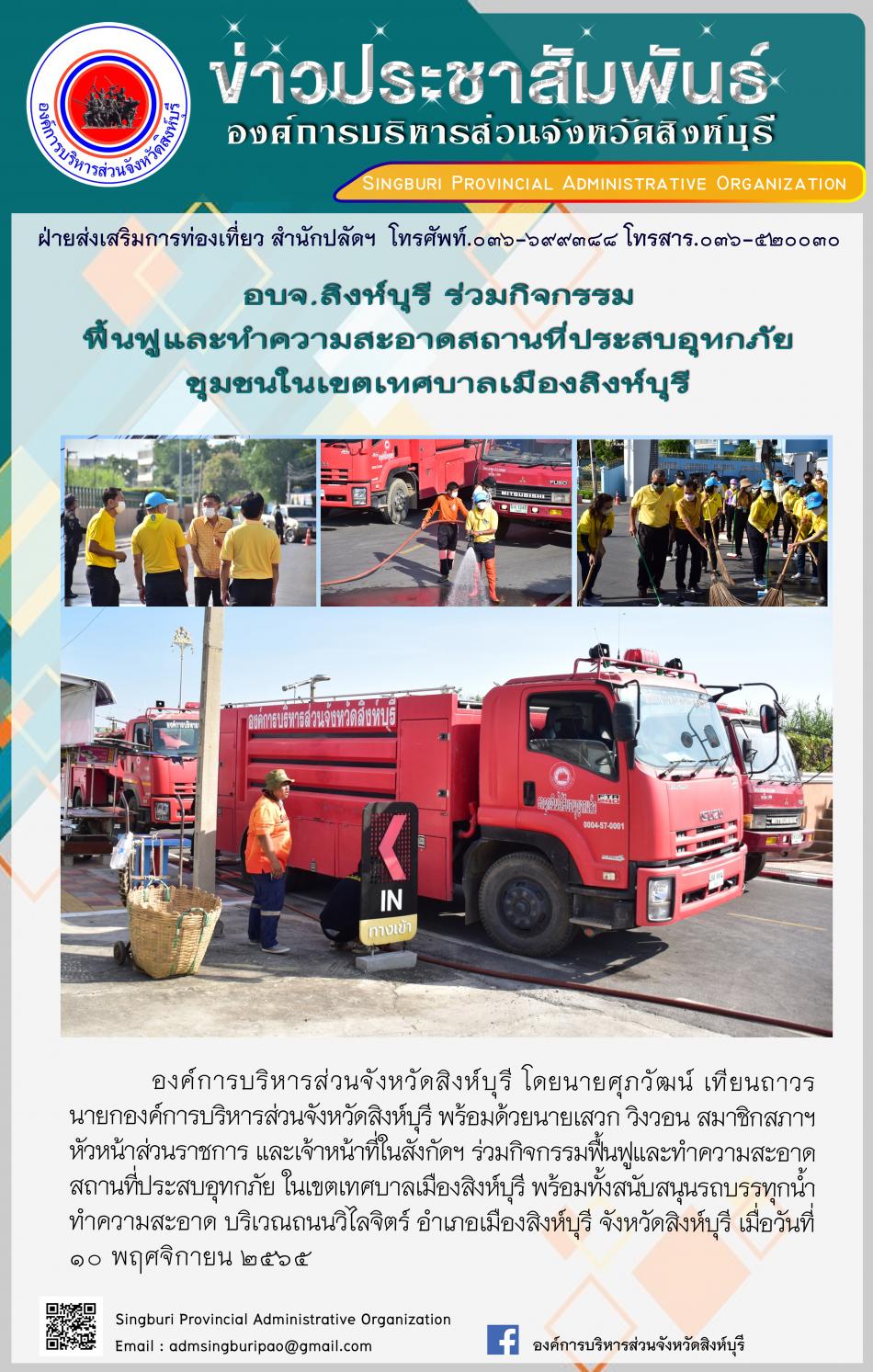 อบจ.สิงห์บุรี ร่วมกิจกรรมฟื้นฟูและทำความสะอาดสถานที่ประสบอุทกภัย ชุมชนในเขตเทศบาลเมืองสิงห์บุรี [10 พฤศจิกายน 2565]