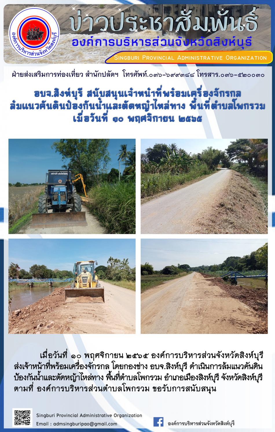 อบจ.สิงห์บุรี สนับสนุนเจ้าหน้าที่และเครื่องจักรกลล้มแนวงคันดินป้องกันน้ำและตัดหญ้าไหล่ทาง พื้นที่ตำบลโพกรวม [10 พฤศจิกายน 2565]