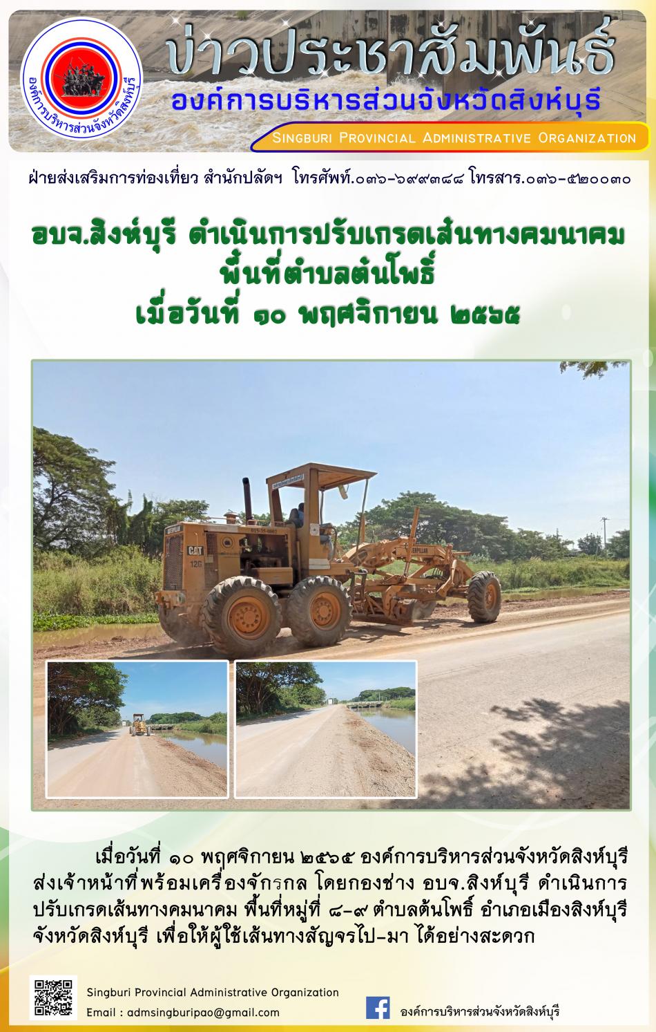 อบจ.สิงห์บุรี ดำเนินการปรับเกรดเส้นคมนาคม พื้ยที่ตำบลต้นโพธิ์ [10 พฤศจิกายน 2565]