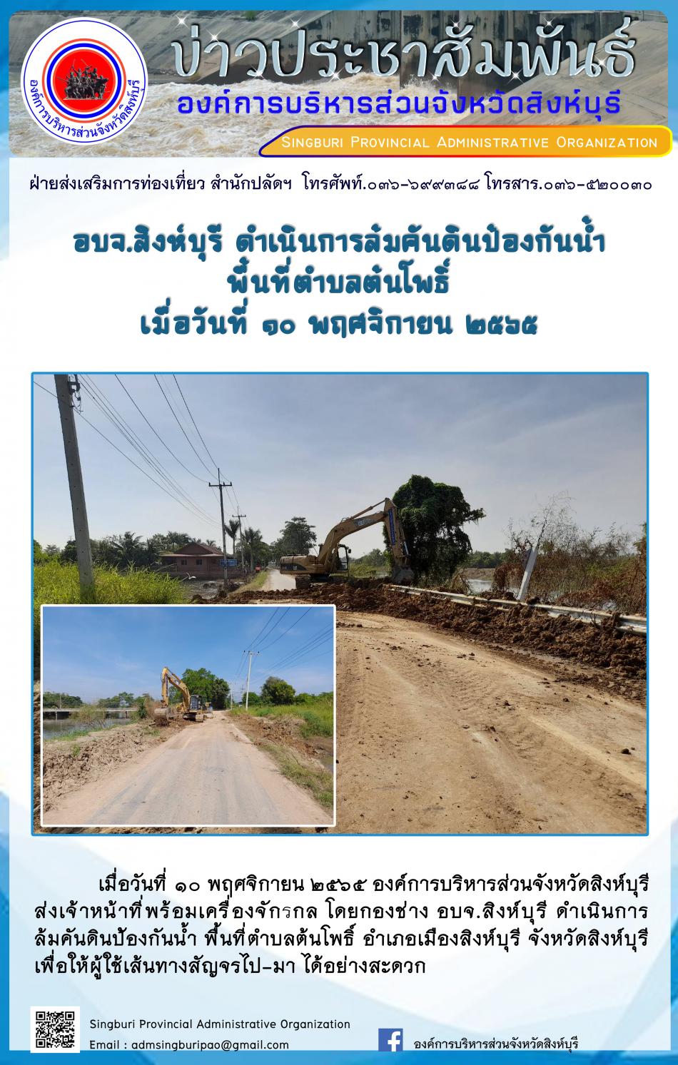 อบจ.สิงห์บุรี ดำเนินการล้มคันดินป้องกันน้ำ พื้นที่ตำบลต้นโพธิ์ [10 พฤศจิกายน 2565]