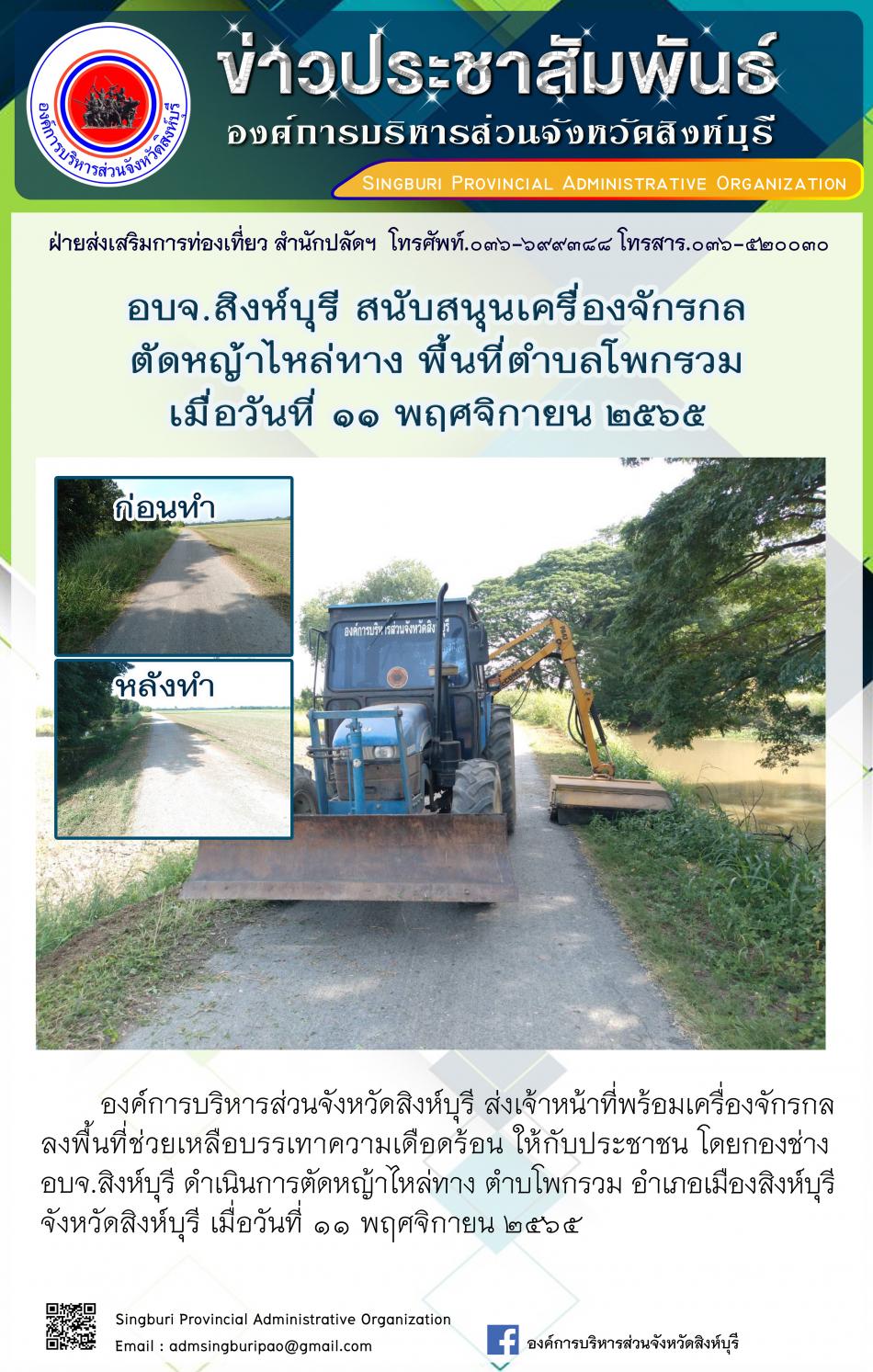 อบจ.สิงห์บุรี สนับสนุนเครื่องจักรกล ตัดหญ้าไหล่ทาง พื้นที่ตำบลโพกรวม [11 พฤศจิกายน 2565]