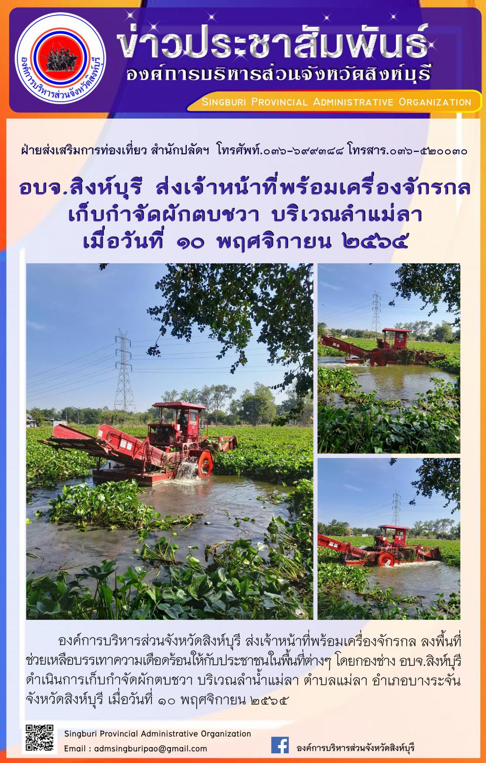อบจ.สิงห์บุรี ส่งเจ้าหน้าที่พร้อมเครื่องจักรกลเก็บกำจัดผักตบชวา บริเวณลำแม่ลา [10 พฤศจิกายน 2565]