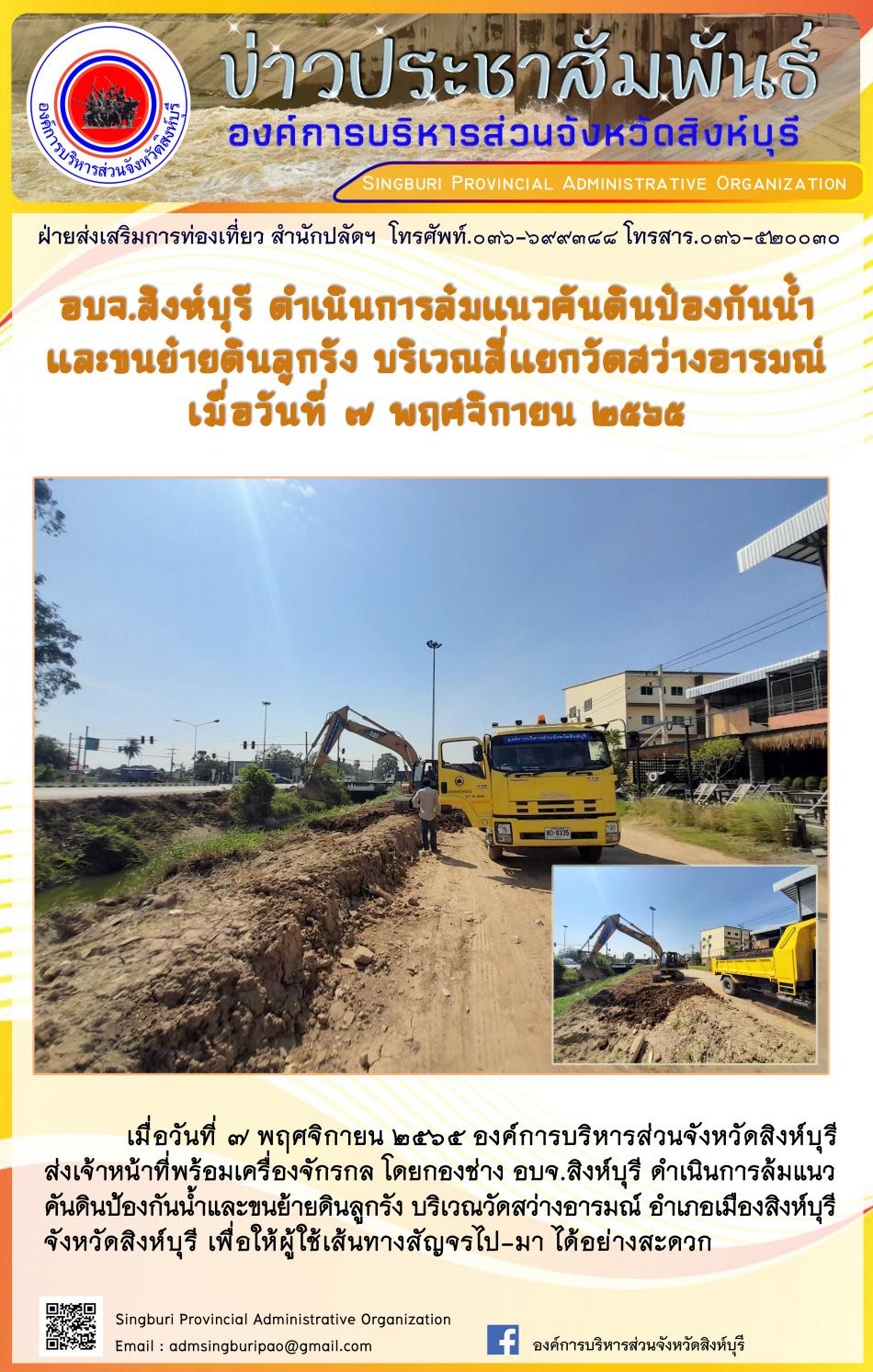 อบจ.สิงห์บุรี ดำเนินการล้มแนวคันดินป้องกันน้ำ และขนย้ายดินลูกรัง บริเวณสี่แยกวัดสว่างอารมณ์ [7 พฤศจิกายน 2565]
