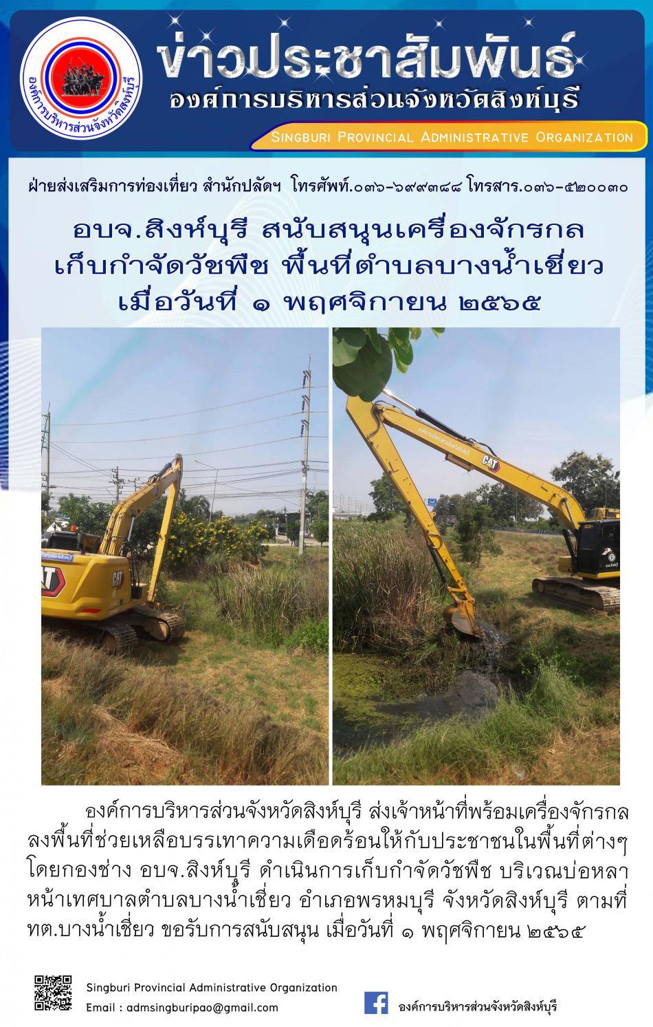 อบจ.สิงห์บุรี สนับสนุนเครื่องจักรกลเก็บกำจัดวัชพืช พื้นที่ ตำบลบางน้ำเชี่ยว [1 พฤศจิกายน 2565]