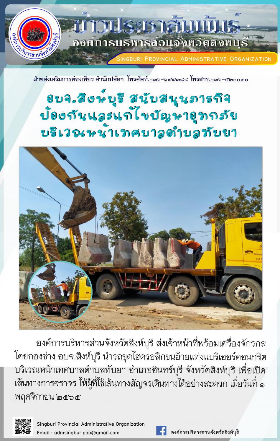 อบจ.สิงห์บุรี สนับสนุนภารกิจป้องกันและแก้ไขปัญหาอุทกภัยบริเวณหน้าเทศบาลตำบลทับยา [1 พฤศจิกายน 2565]