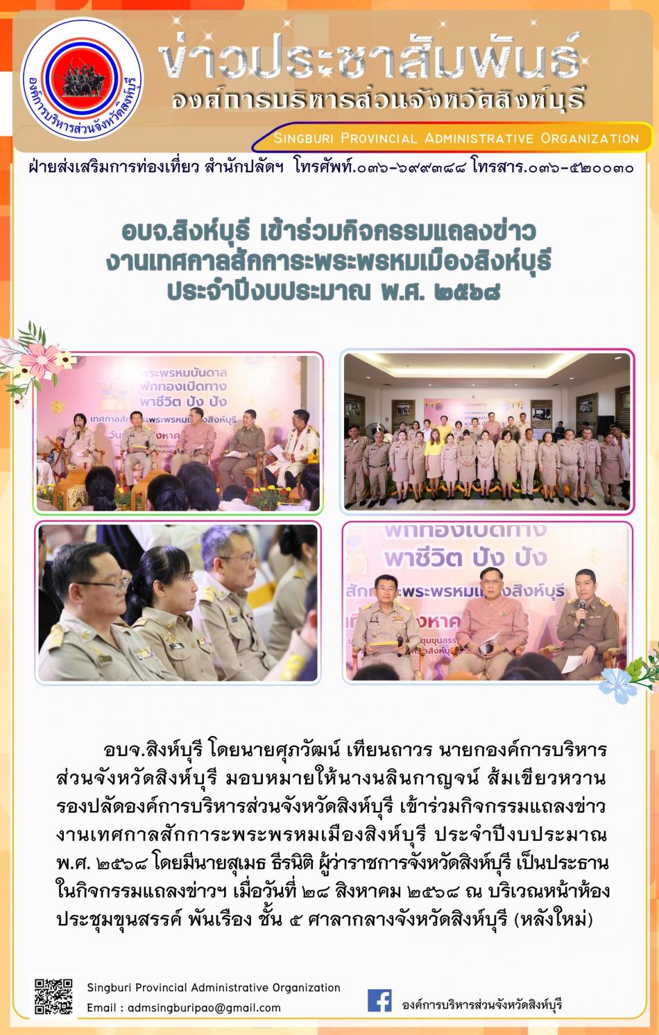 อบจ. สิงห์บุรี เข้าร่วมกิจกรรรมแถลงข่าว งานเทศกาลสักการะพระพรหม ประจำปีงบประมาณ 2568 [28 สิงหาคม 2568]