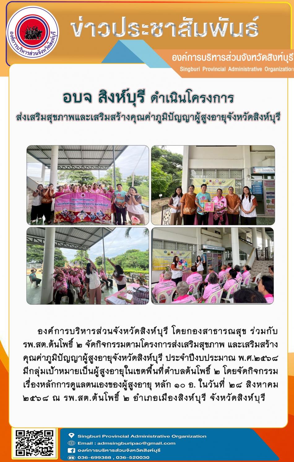 อบจ. สิงห์บุรี ดำเนินโครงการ ส่งเสริมสุขภาพและเสริมสร้างคุณค่าภูมิปัญญาผู้สูงอายุจังหวัดสิงห์บุรี [28 สิงหาคม 2568]