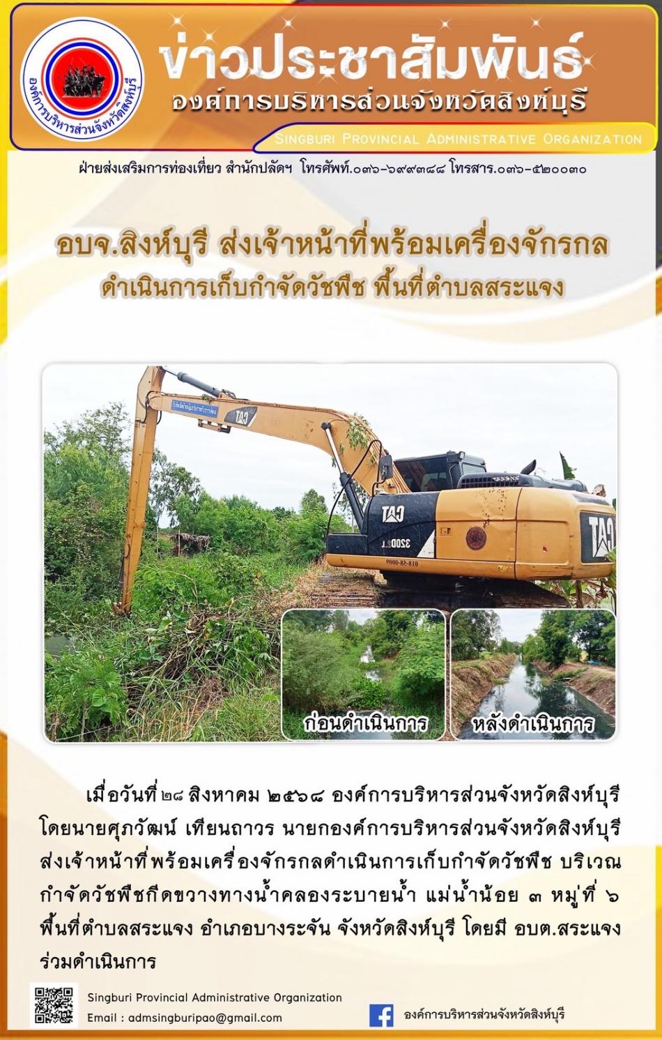 อบจ. สิงห์บุรี ส่งเจ้าหน้าที่พร้อมเครื่องจักรกล ดำเนินการเก็บกำจัดจัดพืช พื้นที่ตำบลสระแจง [28 สิงหาคม 2568]