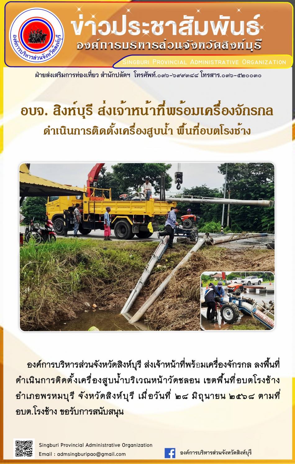 อบจ. สิงห์บุรี ส่งเจ้าหน้าที่พร้อมเครื่องจักรกล ดำเนินการติดตั้งเครื่องสูบน้ำ พื้นที่ อบต. โรงช้าง [28 สิงหาคม 2568]