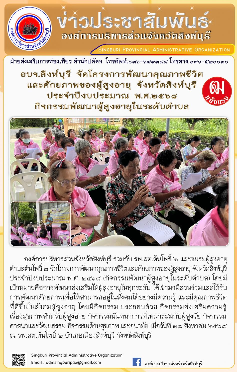 อบจ. สิงห์บุรี จัดโครงการพัฒนาคุณภาพชีวิตและศักยภาพของผู้สูงอายุ จังหวัด สิงห์บุรี ประจำประจำปีงบประมาณปี พ. ศ. 2568 กิจกรรมพัฒนาผู้สูงอายุในระดับตำบลกิจกรรมพัฒนาผู้สูงอายุในระดับตำบล [28 สิงหาคม 2568]