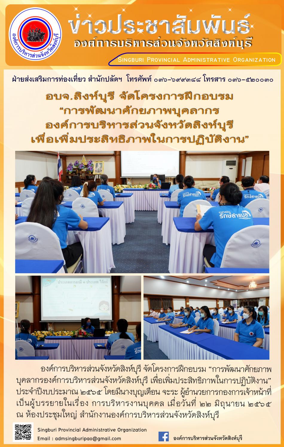 อบจ.สิงห์บุรี จัดโครงการฝึกอบรม "การพัฒนาศักยภาพบุคลากร องค์การบริหารส่วนจังหวัดสิงห์บุรี เพื่อเพิ่มประสิทธิภาพในการปฏิบัติงาน" [22 มิถุนายน 2565]