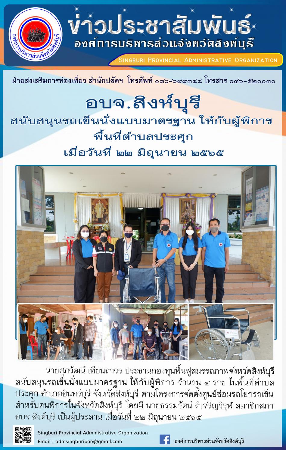 อบจ.สิงห์บุรี สนับสนุนรถเข็นนั่งแบบมาตรฐาน ให้กับผู้พิการ [20 มิถุนายน 2565]