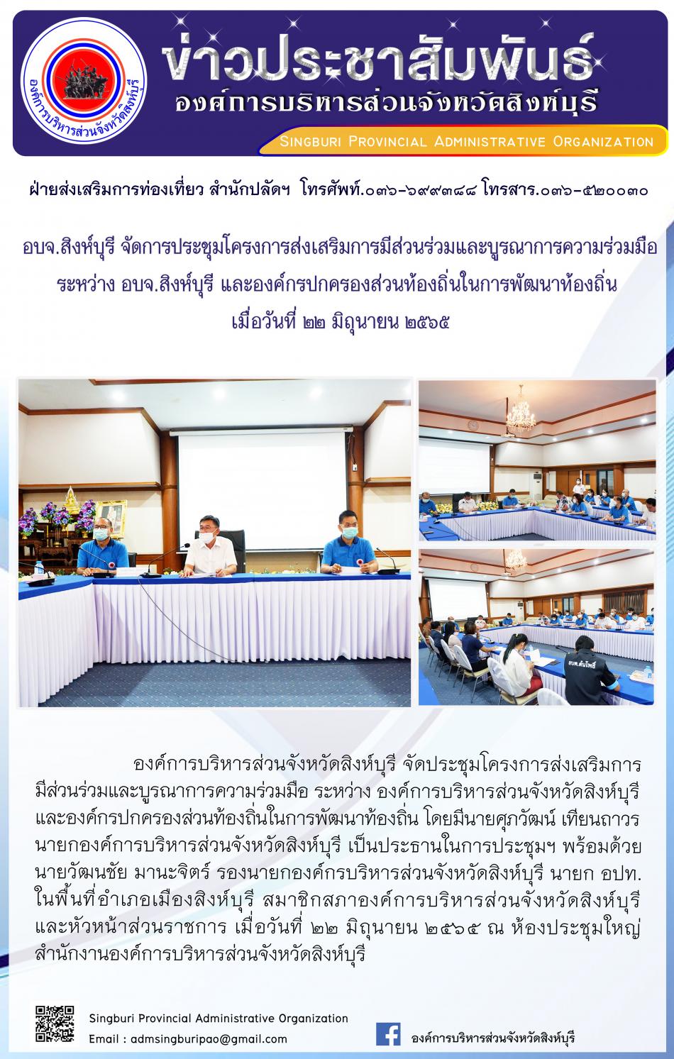 อบจ.สิงห์บุรี จัดการประชุมโครงการส่งเสริมการมีส่วนร่วมและบูรณาการความร่วมมือ ระหว่าง อบจ.สิงห์บุรี และองค์กรปกครองส่วนท้องถิ่นในการพัฒนาท้องถิ่น [22 มิถุนายน 2565]