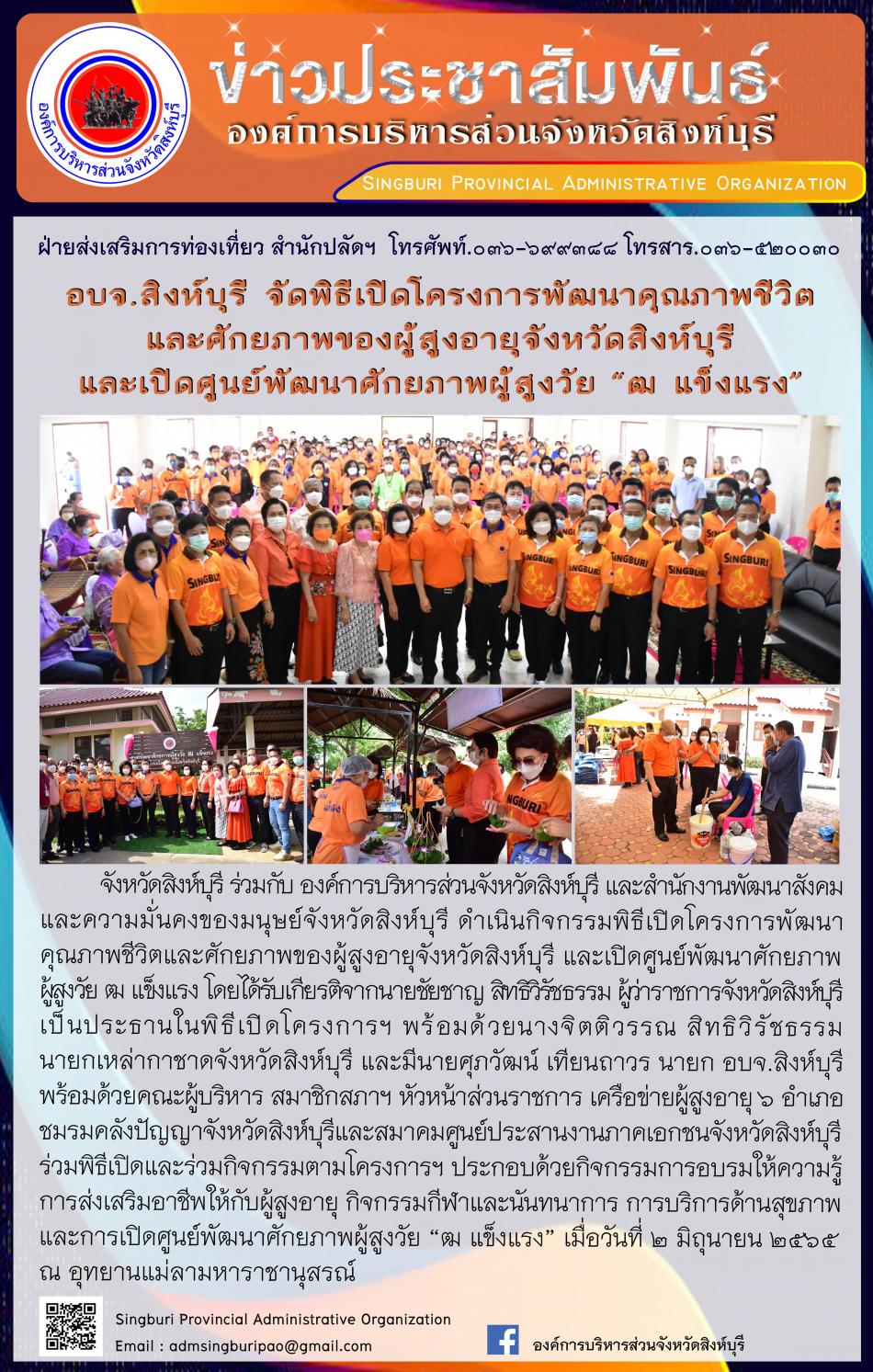 อบจ.สิงห์บุรี จัดพิธีเปิดโครงการพัฒนาคุณภาพชีวิต และศักยภาพผู้สูงวัย "ฒ แข็งแรง" [2 มิถุนายน 2565]