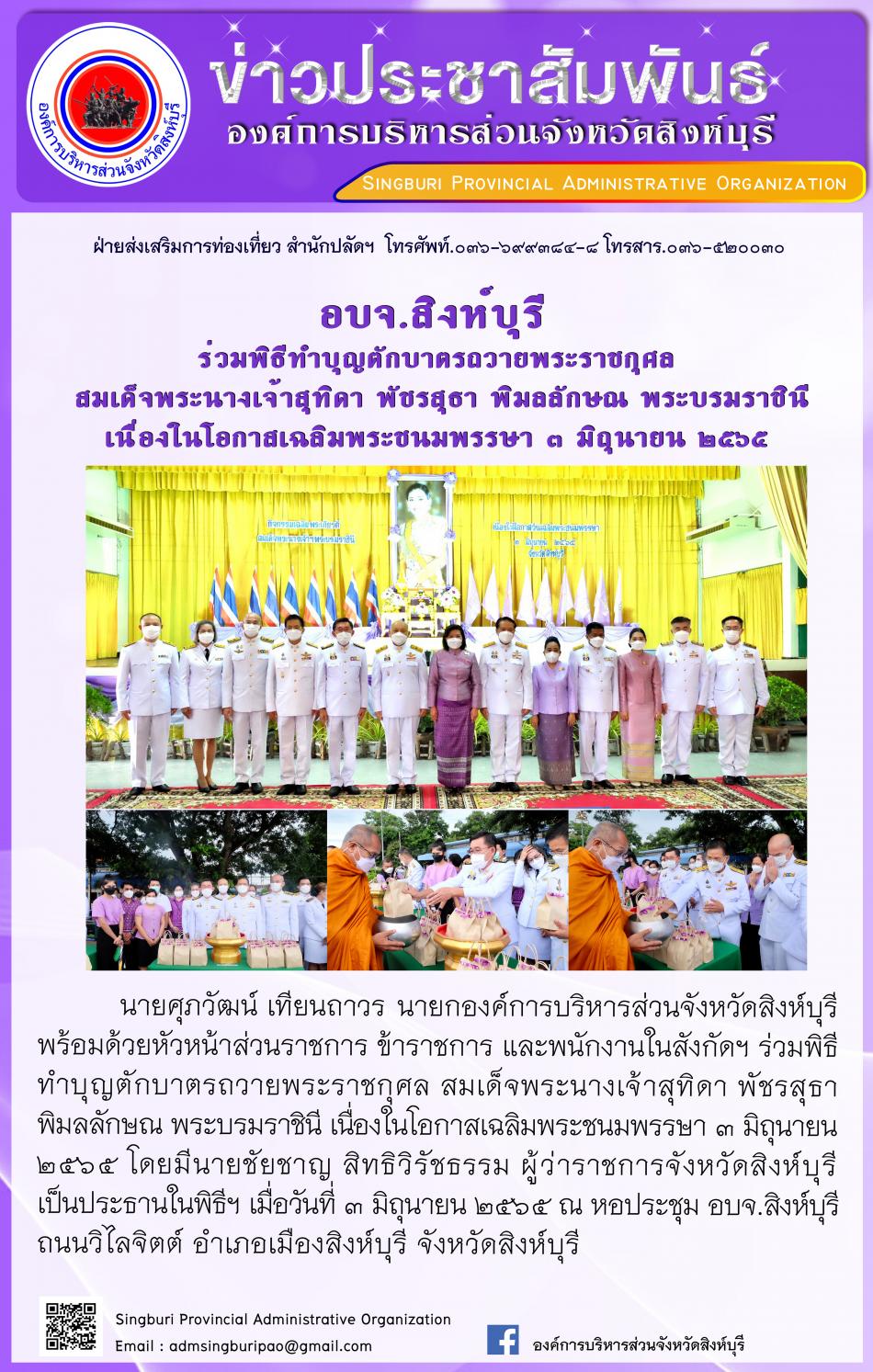 อบจ.สิงห์บุรี ร่วมพิธีทำบุญตักบาตรถวายพระราชกุศล สมเด็จพระนางเจ้าสุทิดา พัชรสุธาพิมลลักษณ พระบรมราชินี เนื่องในโอกาสวันเฉลิมพระชนมพรรษา 3 มิถุนายน 2565 [3 มิถุนายน 2565]