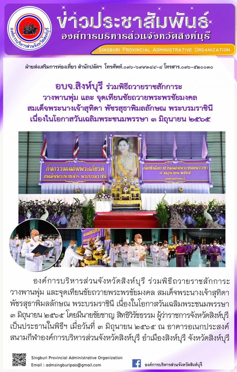 อบจ.สิงห์บุรี ร่วมพิธีถวายราชสักการะ วางพานพุ่ม และจุดเทียนชัยมงคล สมเด็จพระนางเจ้าสุทิดา พัชรสุธาพิมลลักษณ พระบรมราชินี เนื่องในโอกาสวันเฉลิมพระชนมพรรษา 3 มิถุนายน 2565 [3 มิถุนายน 2565]