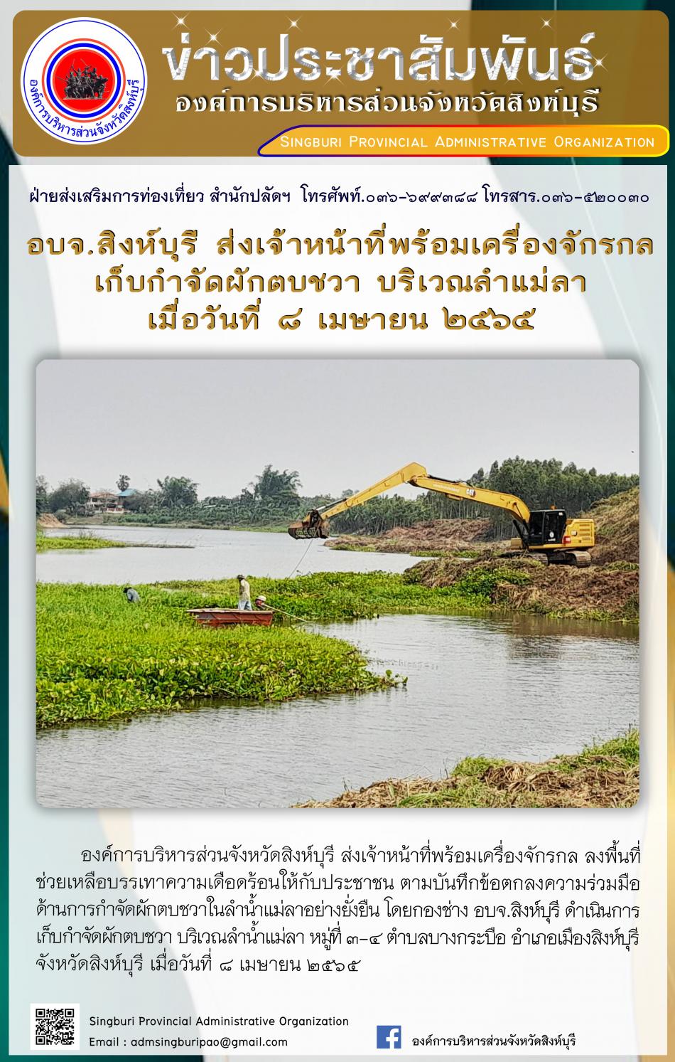 อบจ.สิงห์บุรี ส่งเจ้าหน้าที่พร้อมเครื่องจักรกล เก็บกำจัดผักตบชวา บริเวณลำแม่ลา [8 เมษายน 2565]