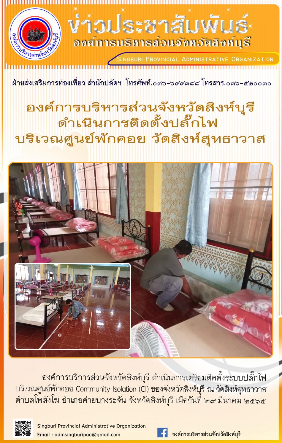 องค์การบริหารส่วนจังหวัดสิงห์บุรี ดำเนินการติดตั้งปลั้กไฟ บริเวณศูนย์พักคอย วัดสิงห์สุทธาวาส [29 มีนาคม 2565]