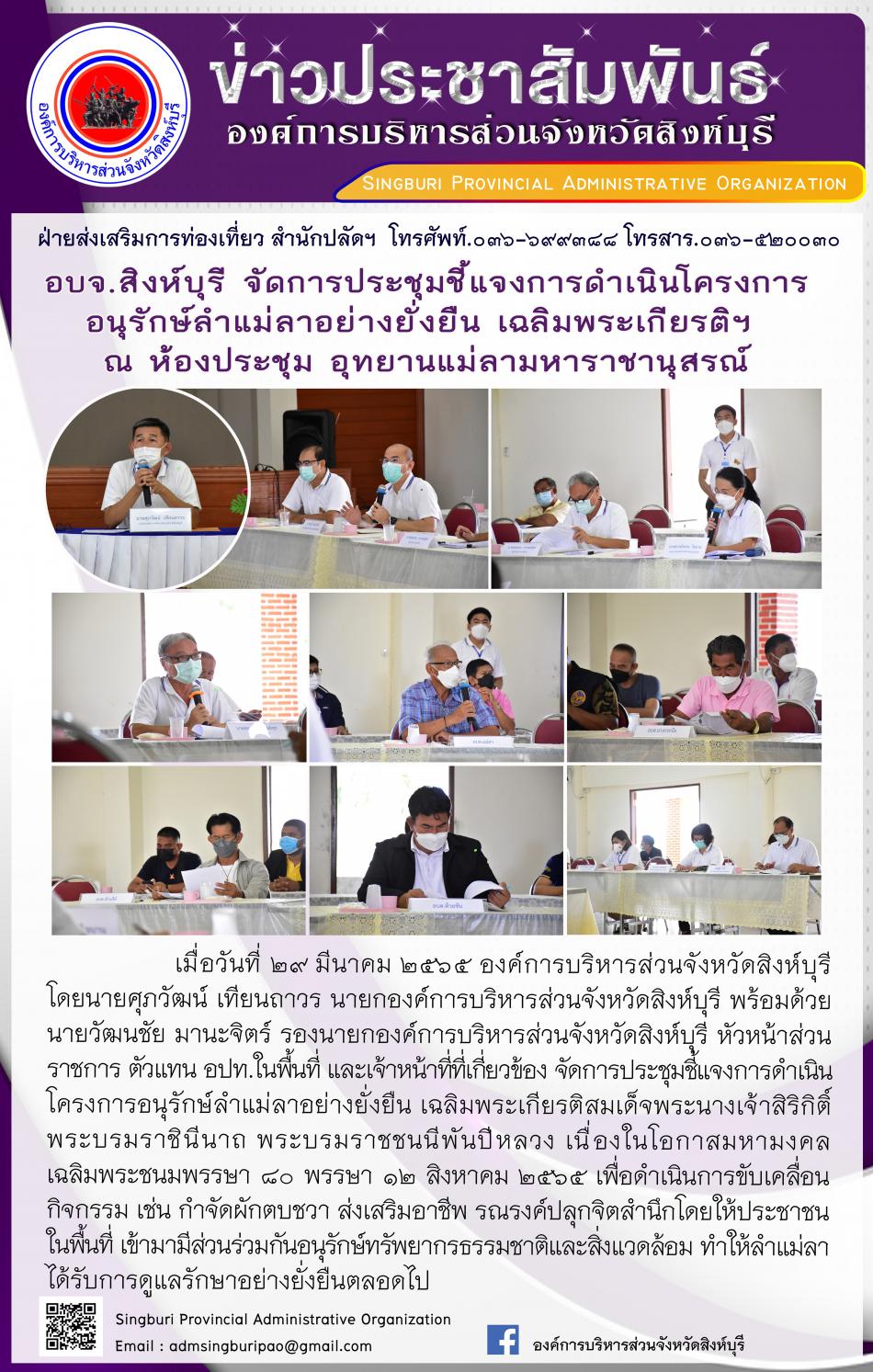 อบจ.สิงห์บุรี จัดการประชุมชี้แจงการดำเนินโครงการ อนุรักษ์ลำแม่ลาอย่างยั่งยืนเฉลิมพระเกียรติฯ ณ ห้องประชุมอุทยานแม่ลามหาราชานุสรณ์ [29 มีนาคม 2565]