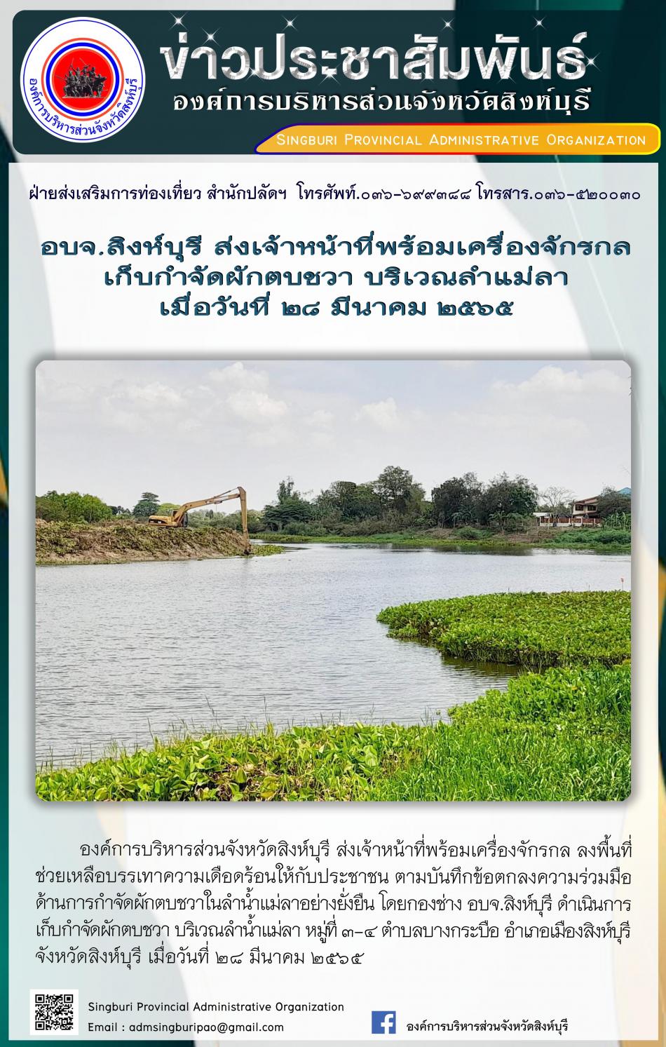 อบจ.สิงห์บุรี ส่งเจ้าหน้าที่พร้อมเครื่องจักรกล เก็บกำจัดผักตบชวา บริเวณลำแม่ลา [28 มีนาคม 2565]